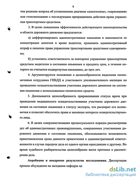 9 нистративной деятельности органов внутренних дел Омской академии МВД России. Материалы и результаты проведенного исследования используются в образовательном процессе и научно-исследовательской деятельности Нижегородской академии МВД России. Ряд положений диссертационного исследования, в том числе методические рекомендации по выявлению водителей, управляющих транспортными средствами в состоянии опьянения внедрены в практику работы подразделений ДПС ГИБДД ГУВД Пермской области, мировых судей Пермской области, что подтверждено соответствующими актами о внедрении.