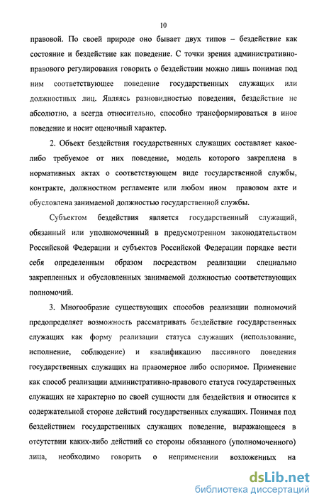 10 правовой. По своей природе оно бывает двух типов - бездействие как состояние и бездействие как поведение. С точки зрения административно-правового регулирования говорить о бездействии можно лишь понимая под ним соответствующее поведение государственных служащих или должностных лиц. Являясь разновидностью поведения, бездействие не абсолютно, а всегда относительно, способно трансформироваться в иное поведение и носит оценочный характер.