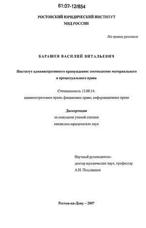 Степень разработанности темы исследования. Проблематика института административно-правового принуждения как вида государственного принуждения в настоящее время активно разрабатывается в науке административного права. В частности, общие вопросы механизма административного принуждения в настоящее время исследуются такими авторами как Д.Н. Бахрах, К.С. Вельский, А.А. Демин, Ю.А. Денисов, И.В. Максимов, М.Я. Масленников, С Л. Махина, В.Г. Розенфельд, В.Д. Сорокин, Ю.Н. Старилов, Ю.А. Тихомиров, А.Ю. Якимов и др. Вопросы реализации института административного принуждения разрабатывались такими авторами как А.ГЇ. Алехин, И.И. Веремеенко, В.К. Гижевский, М.И. Еропкин, А.П. Коренев, Ю.П. Соловей и др. Вместе с тем, системных исследований, направленных на разработку общего учения о проблематике соотношения материальных и процессуальных аспектов применения мер административно-правового принуждения на сегодняшний день практически нет.
