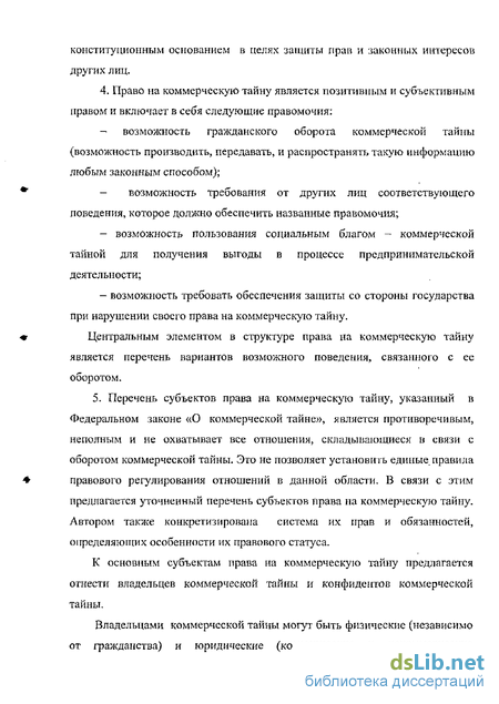 5. Перечень субъектов права на коммерческую тайну, указанный в Федеральном законе «О коммерческой тайне», является противоречивым, неполным и не охватывает все отношения, складывающиеся в связи с оборотом коммерческой тайны. Это не позволяет установить единые правила правового регулирования отношений в данной области. В связи с этим предлагается уточненный перечень субъектов права на коммерческую тайну. Автором также конкретизирована система их прав и обязанностей, определяющих особенности их правового статуса.