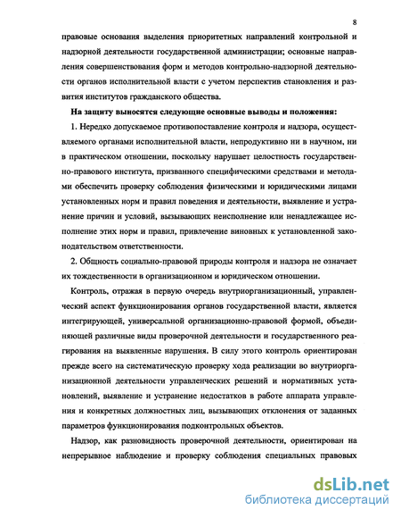 Сформулированные в диссертации положения и выводы, касающиеся сущности и содержания контрольно-надзорной деятельности, правового статуса осуществляющих ее субъектов исполнительной власти на федеральном и региональном уровнях, совершенствования правового регулирования организационно-правовых форм, методов и средств проверочной деятельности,