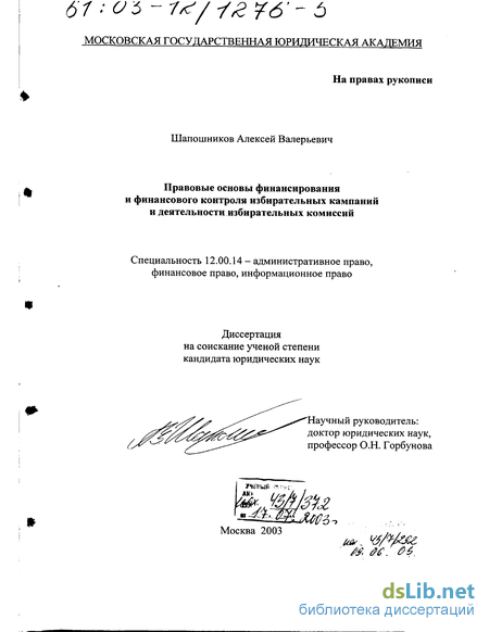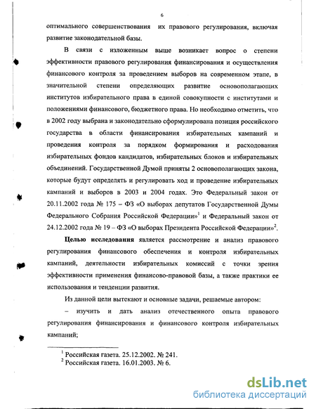 Законодательную и практическую основу диссертации составили: Конституция Российской Федерации, федеральные законы, акты избирательных комиссий (Центральной избирательной комиссии Российской Федерации, избирательных комиссий некоторых субъектов Российской Федерации), касающиеся аспектов финансового обеспечения и финансового контроля избирательных кампаний, отдельные постановления Конституционного Суда Российской Федерации, а также некоторые решения (определения) Верховного Суда Российской Федерации.