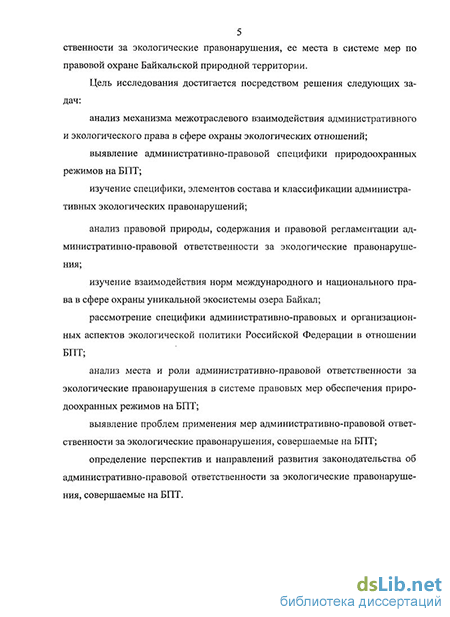 Цели и задачи исследования. Целью диссертационной работы является комплексное исследование механизма административно-правовой ответственности за экологические правонарушения, ее места в системе мер по правовой охране Байкальской природной территории.