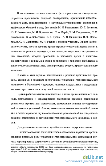 Целью работы являются комплексное, с точки зрения системного подхода, исследование и характеристика содержания правовой организации управления строительным комплексом, определение понятия государственной политики в указанной области, выявление основных тенденций её развития, а также выработка научно обоснованных рекомендаций по совершенствованию организации и деятельности градостроительного комплекса в России.