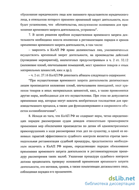 В завершение хотелось бы отметить, что далеко не все ученые- административисты считают необходимым и обоснованным включение временного запрета деятельности в состав мер обеспечения производства по делам об административных правонарушениях. Так А.И. Каплунов считает, что и административное приостановление деятельности, и временный запрет деятельности «следует отнести к предупреждению как правовой форме государственного принуждения, а не к наказанию и процессуальному обеспечению»" . Д.С. Дубровский полагает, что не только временный запрет деятельности, но и административное приостановление деятельности по своему характеру являются мерами пресечения, цель которых заключается в немедленном пресечении наиболее опасных правонарушений. Непосредственно использование таких пресекательных полномочий должно осуществляться должностными лицами органов исполнительной власти во внесудебном порядке. Учитывая неразрешимые сложности, возникающие с приостановлением деятельности объектов, имеющих нескольких сособственников, временный запрет деятельности и административное приостановление деятельности не должны быть связаны с производством по делу об административном правонарушении, а осуществляться в качестве единой меры административного пресечения, применяемой в отношении объекта, но не лиц, которым он принадлежит" . По мнению В.В. Ионаш, вместо административного приостановления деятельности необходимо ввести в систему административных наказаний такой вид, как лишение специального права, предоставленного юридическому лицу. Соответственно, срок временного запрета деятельности в таком случае должен определяться сроками рассмотрения конкретного дела. В случае, если при рассмотрении дела будет установлено устранение обстоятельств, указанных в ч. 1 ст. 3.12 КоАП РФ, приостановленная деятельность подлежит возобновлению .