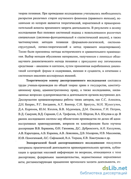 Методологическую основу работы составили имеющиеся достижения теории познания. При проведении исследования учитывалась необходимость раскрытия различных сторон изучаемого феномена (правового явления), основными из которых являются теоретический, нормативный и правоприменительный аспекты временного запрета деятельности. В результате в основу исследования был положен системный подход с использованием различных специальных (системно-функциональный и статистический анализ), а таюке частнонаучных методов познания (формально-логический, системно- структурный, логико-теоретический и метод правового моделирования). Также были применены методы исторического и сравнительного правоведения. Выбор методов обусловлен материалом, полученным с помощью общенаучного диалектического метода познания с присущими ему логическими средствами - анализом и синтезом, путем применения выработанных диалектикой категорий: формы и содержания, явления и сущности, в сочетании с системным анализом исследуемых явлений.