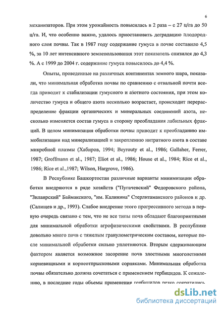 Минимальная обработка почвы способствует сбережению энергоресурсов, снижению эрозии и повышению запасов продуктивной влаги для сельскохозяйственных культур и широко используется во многих странах (House et al., 1984; Elliott et al., 1986; Гамзиков и др, 1987; Gallaher, Ferrer,. 1987; Groffmann et al., 1987; Громов и др., 1991; Коломиец, 1993; Петренко, Лазник, 1987; Шульмейстер и др, 1993; Савич и др., 2007; Curaqueo et al., 2008; Jabro et al, 2008; Madarasz et al., 2008; Mrabet et al., 2008 ). Так, в США в 1983 г. 63% всей площади пашни подвергалось минимальной обработке, а к 2000 г. уже планировалось охватить ею 90% пашни (Beyrouty et al., 1986)].