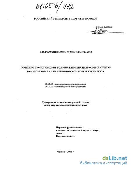 Считаю своим долгом выразить благодарность за помощь в проведении полевых исследований сотрудникам ВНИИЦиСК доктору наук В.М.Горшкову и ВНИИСХ кандидату с/х наук Р.ДАгрба; эксперту по плодовым культурам Научно-исследовательской станции при дворце султана Кабуса в Омане доктору наук Ахмеду Хамуди. Я благодарю сотрудников инструментальной лаборатории химических анализов Почвенного института имени В.В.Докучаева РАСХН РФ за содействие в организации и выполнении химических анализов почв и растений. Особую благодарность и признательность выражаю научному руководителю А.Ю.Куленкампу и заведующему кафедрой почвоведения, агрохимии и агроэкологии Российского университета дружбы народов за внимание и оказанную помощь при обобщении материалов исследований и оформлении диссертации Ларешину В.Г.