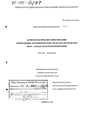 Воропаев Вячеслав Николаевич. Агроэкологическое обоснование применения агрохимических средств в земледелии юго-запада Нечерноземной зоны : Дис. ... д-ра с.-х. наук : 06.01.04 : Воронеж, 2003 372 c. РГБ ОД, 71:04-6/47