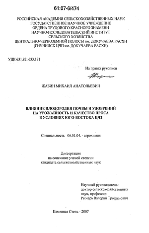 Автор работы приносит глубокую благодарность коллективам отдела агрохимии НИИСХ ЦЧП им. В.В.Докучаева, ФГУ САС «Таловская» и лично Беспаловой Н.С и Мухиной СВ. за оказанную помощь в проведении полевых и лабораторных исследований.