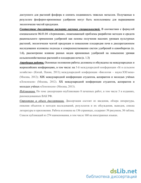 Апробация работы. Основные положения работы доложены и обсуждены на международных и всероссийских конференциях, в том числе: на 5-й международной конференции «Si в сельском хозяйстве» (Китай, Пекин, 2011); международной конференции «Биология – наука XXI века» (Москва, 2012); XIX международной конференции студентов, аспирантов и молодых учёных «Ломоносов» (Москва, 2012). XX международной конференции студентов, аспирантов и молодых учёных «Ломоносов» (Москва, 2013).