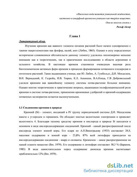 энергоресурсов требуют широкого внедрения новых, экологически безопасных и вместе с тем высокоэффективных методов ведения сельского хозяйства. Во многом деградация сельскохозяйственных угодий и снижение качества сельскохозяйственной продукции связаны с несбалансированным питанием растений (Курганова, 2002, Минеев, 1990). Высокая распространенность кремния в почве (от 200 до 350 г Si кг-1 в глинистых почвах и от 450 до 480 г Si кг-1 в песчаных) обеспечивает значимую роль элемента в процессах почвообразования и формировании плодородия почв (Ковда, 1985). Кроме твердых форм кремния, представленных различными минералами, в почве и почвенных водах содержатся растворимые формы Si: мономеры и полимеры кремниевой кислоты (Матыченков, 2007). Растений, в том числе и культурные, поглощают только мономеры кремниевой кислоты и ее анионы (Yoshida, 1975; Ma & Takahashi, 2003). Ежегодно сельскохозяйственными растениями безвозвратно выносится от 20 до 700 кг/га Si (Базилевич и др.,1975; Реймерс, 1990; Bocharnikova, Matichenkov, 2012). Эта величина сопоставима с вынос таких макроэлементов как фосфор, азот и калий.
