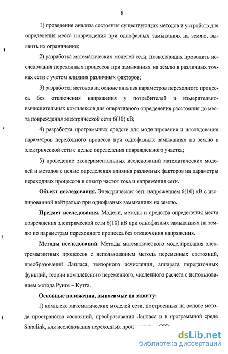 Предмет исследования. Модели, методы и средства определения места повреждения электрической сети 6(10) кВ при однофазных замыканиях на землю по параметрам переходного процесса без отключения потребителей.