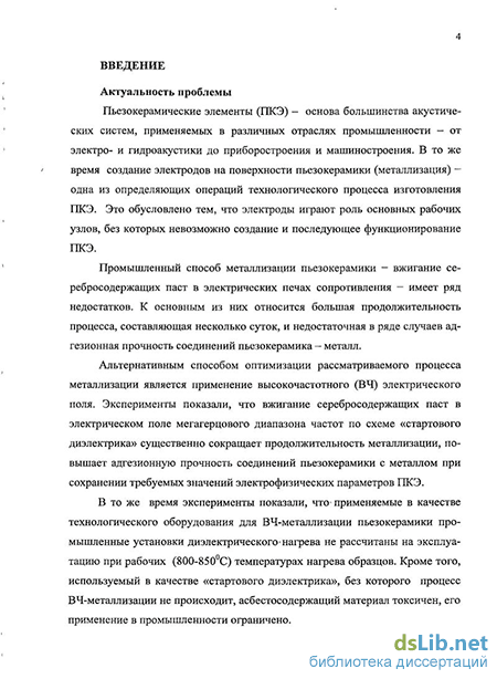 Одним из путей устранения недостатков промышленной технологии является применение для нагрева металлизируемых образцов электрофизических полей, в частности, высокочастотного (ВЧ) электрического поля. Эксперименты показали, что вжигание паст в электрическом поле мегагерцевого диапазона частот по схеме «стартового диэлектрика» позволяет значительно сократить продолжительность металлизации, повышает адгезионную прочность соединений пьезокерамики с металлом, при сохранении требуемых значений электрофизических параметров ПКЭ.