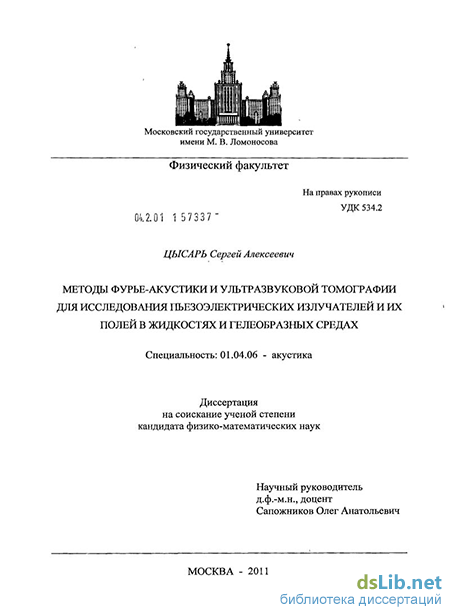 Основной целью диссертационной работы являлось теоретическое и экспериментальное исследование пьезоэлектрических излучателей и их полей в жидкостях и гелеобразных средах методами ультразвуковой томографии и акустической голографии, включая методы фурье-акустики и интеграла Рэлея. В соответствии с заявленной целью было намечено решение следующих практически значимых задач: