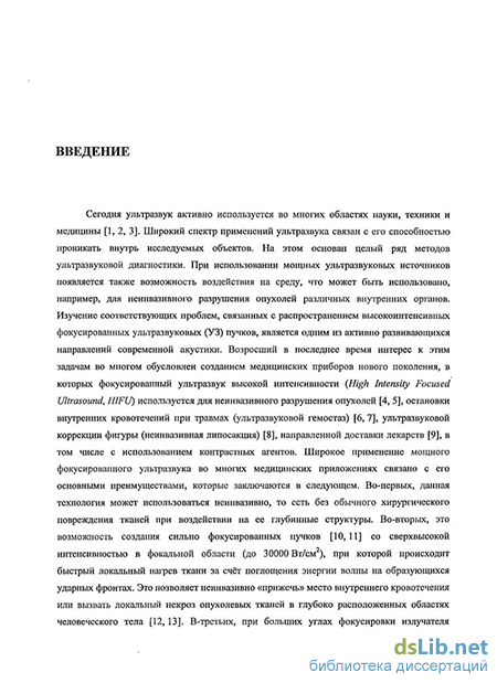 Сегодня ультразвук активно используется во многих областях науки, техники и медицины. Широкий спектр применений ультразвука связан с его способностью проникать внутрь исследуемых объектов. На этом основан целый ряд методов ультразвуковой диагностики. При использовании мощных ультразвуковых источников появляется также возможность воздействия на среду, что может быть использовано, например, для неинвазивного разрушения опухолей различных внутренних органов. Изучение соответствующих проблем, связанных с распространением высокоинтенсивных фокусированных ультразвуковых (High Intensity Focused Ultrasound, HIFU) пучков, является одним из активно развивающихся направлений современной акустики.