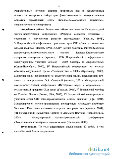 последовательного определения кислых компонентов и хлоридов в одной пробе природной воды, отличающаяся экспрессностью, надежностью, хорошей точностью и простотой выполнения. Предложены методики определения лекарственных препаратов различного химического строения с использованием полупроводникового электрода в качестве индикаторного методами кислотно-основного, осадительного титрования.
