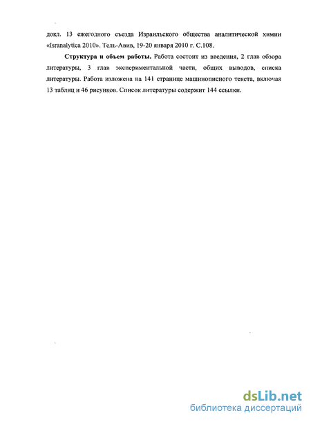 Апробация работы. Основные результаты диссертационной работы доложены на российских и международных конференциях, в том числе на: Международных конференциях аспирантов и студентов по фундаментальным наукам «Ломоносов» (Москва, 2007-2009), II и III Всероссийской конференциях «Аналитика России» (Краснодар, 2007 и 2009), Всероссийском симпозиуме «Хроматография в химическом анализе и физико-химических исследованиях» (Москва, 2007), Всероссийском симпозиуме «Хроматография и хромато-масс-спектрометрия» (Москва, 2008), VII Всероссийской конференции по анализу объектов окружающей среды «Экоаналитика-2009» (Йошкар-Ола, 2009), 13 ежегодном съезде Израильского общества аналитической химии «Isranalytica 2010» (Тель-Авив, 2010).