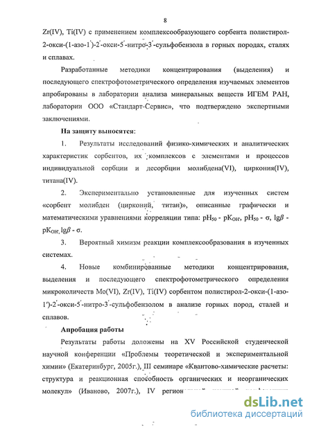 Полученные нами корреляционные зависимости позволяют также прогнозировать улучшение аналитических свойств сорбентов. Введение двух заместителей в орто- и пара- положения приведет к взаимному усилению их влияния, что количественно выражается в увеличении значений а0+п, а значит к смещению рНопт в более кислую область. Исследование свойств синтезированных дизамещенных сорбентов подтвердили наше предположение (табл. 6). С введением группы NCb в орто- и «ара-положение к ОН -группе ФАГ сорбента величина рН5о сорбции элемента смещается в более кислую область [1 М НС1 (Zr), 1,3 (Mo), 1,0 (Ті)]. х комплексов с элементами и с целью теоретического прогнозирования свойств сорбентов для изученных систем впервые установлены количественные корреляции между электронными константами Гаммета и значениями рН5о сорбции элементов и lg/? комплексов сорбент-элемент. 2. Установлены впервые для данного класса сорбентов корреляции величин рК ионизации ФАГ сорбента и рН50 сорбции элементов и значениями lg/? образующихся комплексов элемент-сорбенти. Корреляции типа lg/? (рЬЇ5о) и рК он представляют собой зависимости, описываемые математическими уравнениями. .. . Полученные нами впервые для изучаемых систем корреляционные зависимости позволяют проводить целенаправленный поиск, синтез и применение сорбентов в соответствии с целями анализа, особенностью объектов исследования, доступностью реагентов и т.п.