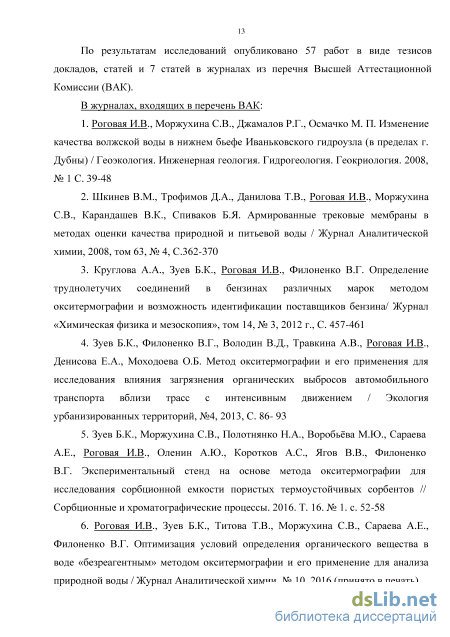6. Роговая И.В., Зуев Б.К., Титова Т.В., Моржухина С.В., Сараева А.Е., Филоненко В.Г. Оптимизация условий определения органического вещества в воде «безреагентным» методом окситермографии и его применение для анализа природной воды / Журнал Аналитической химии, № 10, 2016 (принято в печать) 7. Роговая И.В., Моржухина С.В., Зуев Б.К. Комбинированный мембранно-окситермографический метод в решении геохимических задач миграции вещества природных вод / Geochemistry, № 13, 2016 (принято в печать)