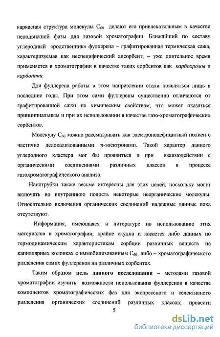 Фуллерены характеризуются высокой термической стабильностью и гидрофобностью, устойчивостью к окислению, способностью к донорно-акцепторным взаимодействиям. Эти свойства, а также сферическая форма и каркасная структура молекулы С6о делают его привлекательным в качестве неподвижной фазы для газовой хроматографии. Ближайший по составу углеродный «родственник» фуллерена - графитированная термическая сажа, характеризуемая как неспецифический адсорбент, - уже длительное время применяется в хроматографии в качестве таких сорбентов как карбохромы и карбонаті.
