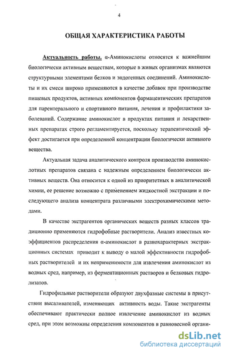 Актуальность работы. -Аминокислоты относятся к важнейшим биологически активным веществам, которые в живых организмах являются структурными элементами белков и эндогенных соединений. Аминокислоты и их смеси широко применяются в качестве добавок при производстве пищевых продуктов, активных компонентов фармацевтических препаратов для парентерального и спортивного питания, лечения и профилактики заболеваний. Содержание аминокислот в продуктах питания и лекарственных препаратах строго регламентируется, поскольку терапевтический эффект достигается при определенной концентрации биологически активного вещества.