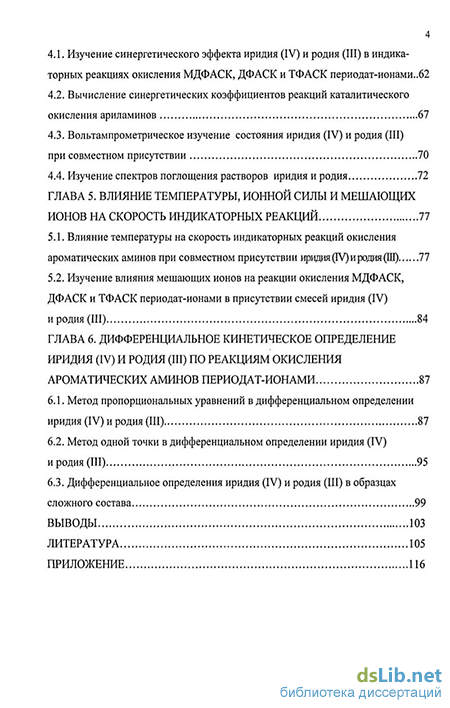 Структура ti объем работы Диссертационная работа состоит из введения, 6 глав, выводов, списка литературы (109 источников) и приложения Работа содержит 49 рисунков и 28 таблиц Общий объем работы 143 страницы В первой главе представлен обзор литературы, в котором кратко рассмотрены методы совместного каталитического определения в анализе, приведены сведения о применении различных физико-химических методов для дифференциального определения металлов платиновой группы Во второй главе описаны используемые реагенты и аппаратура, методы исследования В третьей главе описаны кинетические закономерности реакций каталитического окисления ароматических аминов, определены константы скорости процессов В четвертой главе изложены результаты исследований си-нергетического эффекта иридия (IV) и родия (III) на индикаторные реакции, обсуждаются его возможные причины В пятой главе описаны результаты исследований влияния температуры, ионной силы и мешающих ионов на скорость реакций каталитического окисления ароматических аминов, определены энергии активации процессов В шестой главе изложены результаты дифференциального каталитического определения иридия (IV) и родия (III) по индикаторным реакциям окисления ароматических аминов периодат-ионами, а также приведены методики дифференциального определения катализаторов в образцах сложного состава Далее следуют выводы, список используемой литературы и приложение