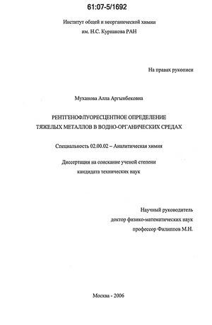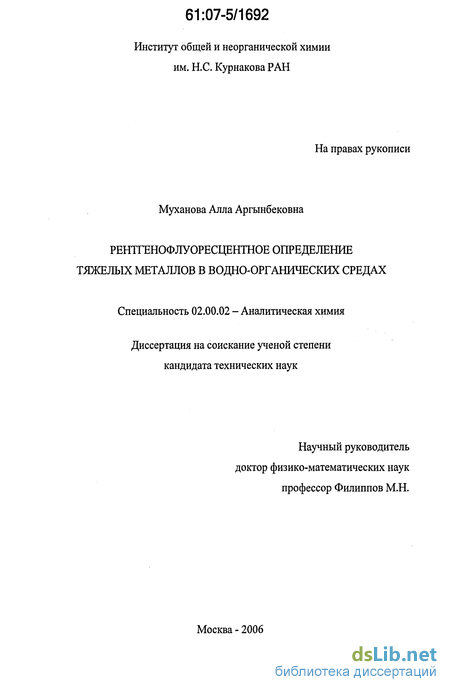 Во введении показаны актуальность темы, цель, задачи, научная новизна и практическая ценность работы. Сформулированы положения, выносимые на защиту, кратко описана структура диссертации. В первой главе дан обзор опубликованных работ по рентгенофлуоресцентному определению тяжелых металлов в жидких пробах, способам пробоподготовки, построения градуировочных характеристик и учета матричных эффектов. Во второй главе предложен способ рентгенофлуоресцентного определения редких и дорогостоящих металлов в водной, водно-органической и органической среде с использованием в качестве ОС водных растворов соединений элементов, являющихся их рентгеновскими аналогами. Третья глава посвящена разработке способа учета различия влияния матриц ОС и анализируемой пробы на интенсивность аналитической линии определяемого элемента с использованием отношения интенсивностей когерентно и некогерентно рассеянного первичного характеристического излучения рентгеновской трубки. В четвертой главе предложен способ рентгенофлуоресцентного определения малых содержаний тяжелых металлов в твердых органических объектах с использованием характеристического излучения подложки для учета вариаций толщины пробы и состава матрицы. Пятая глава посвящена применению разработанных способов для определения Mo, W, Re, Pt в технологических растворах сольвометаллургического производства и определению малых содержаний Pt в кремнийорганических композиционных материалах.