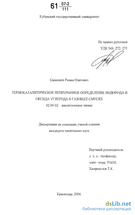 На защиту выносятся. В соответствии с целью проведенных исследований и достигнутыми при этом результатами автор защищает: -термокаталитическое определение водорода и оксида углерода в различных взрыво- и пожароопасных газовых смесях, а также создание на базе разработанных методик сенсоров и газоанализаторов, основанное на изучении электрохимических и кинетических характеристик, определяемых газовых компонентов, которое ставило своей целью улучшение метрологических параметров методик, эксплуатационных и технических характеристик сенсоров и газоанализаторов; -результаты по оценке активности и селективности индивидуальных оксидов металлов и их смесей при окислении горючих веществ, положенные в основу разработки селективных термокаталитических методик определения водорода и оксида углерода, обладающих необходимыми аналитичесішми характеристиками, используемых, для решения различных задач; -экспериментальные данные по изучению кинетики и механизма окисления оксида углерода на поверхности катализатора измерительного и компенсационного ЧЭ селективного ТКС; -теоретические предпосылки по конструкции и технологии изготовления селективных ТКС и автоматических газоанализаторов Н2 и СО; -способ приготовления и аттестация модельных, поверочных газовых смесей 1 и СО с воздухом в широких интервалах концентраций (на уровне ПДК и выше) для оценки метрологических характеристик разработанных сенсоров; -результаты влияния напряжения источника питания, температуры, давления, влажности газовой среды и др. факторов на метрологические и технические характеристики разработанных селективных ТКС и автоматических газоанализаторов водорода и оксида углерода.