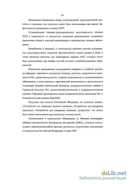Разработаные и внедреные в клиническую практику методы исследования микроциркуляции слизистой простатического отдела уретры и кожи в точке проекции простаты для мониторинга терапии ХУП которые могут быть использованы при выборе способа лечения и реабилитационных мероприятий больных ХУП.