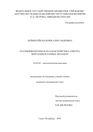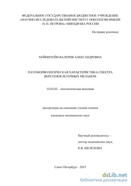 В зарубежной литературе насчитывается большое количество работ, посвященных меланомам с веретеноклеточным фенотипом, а в отечественной литературе таких работ практически не встречается (Barnhill R. L., 2009, Clark W. H., 1986, Lever W. F., 1983, Massi G., 2013, McKee P. H., 2002, Mooi W., 2007, Sade S., 2010, Weedon D., 2002). Меланомы, состоящие из популяции веретеновидных клеток, обозначают термином «веретеноклеточная меланома» (ВМ), однако четкое определение данного понятия и диагностические критерии отсутствуют. При этом одни авторы рассматривают ВМ как отдельную нозологию, другие исследователи используют данный термин лишь как описательный, что создает определенную понятийную путаницу. Вместе с тем, большое количество исследований описывают десмопластическую меланому, которая, по мнению одних авторов, является подгруппой веретеноклеточной меланомы, а другие трактуют ее самостоятельной формой (Almeida L. S., 2008, Anstey A., 1993, Beenken S., 1989, Bruijn J. A., 1992, Busam K. J., 2005, Chen L. L., 2013, Conley J., 1971, Egbert B., 1988, From L., 1983, Jain S., 1989, Lens M. B., 2005, Livestro D. P., 2005, Manganoni A. M., 2009, McCarthy S. W., 2006, Miller D. D., 2012, Quinn M. J., 1999, Reed R. J., 1979, Wasif N., 2011, Weissinger S. E., 2014). Лишь небольшое число работ отмечает влияние морфологии на прогноз и биологическое поведение меланомы, данные их противоречивы (Лилова В.А., 1975, Clark W. H., 1969, Jones W. M., 1968, Sndergaard K., 1985, Williams W. J., 1968).