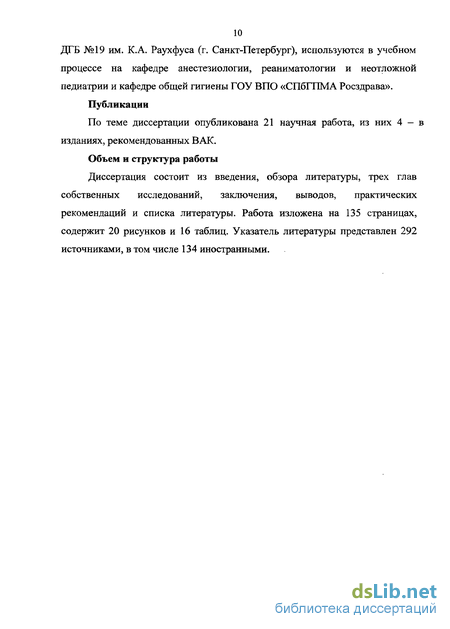Апробация и пути реализации работы Основные положения диссертационной работы представлены на IV Международном Конгрессе «Эколого-социальные вопросы защиты и охраны здоровья молодого поколения на пути в XXI век», СПб., 1-4 июня 1998 г.; на научно-практической конференции «Педиатрия на рубеже веков. Проблемы, пути развития», посвященной 75-летию СПбГПМА, СПб., 17-18 мая 2000 г.; на VII Всероссийском съезде анестезиологов и реаниматологов, СПб., 25-27 сентября 2000 г.; на научно-практической конференции «Социальная педиатрия - проблемы, поиски, решения», СПб, 28 ноября 2000 г.; на юбилейной научно-практической конференции к 100-летию клинической больницы и 80-летию СПбГПМА, СПб, 24-25 мая 2005 г.; на Российской научной конференции, посвященной 140-летию кафедры детских болезней ВМА и приуроченной к 120-летию со дня рождения М.С. Маслова, СПб., 30 июня 2005 г.; изложены в 21 научной публикации. Результаты исследования применяются на практике в работе отделения анестезиологии и реанимации