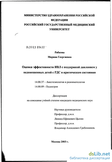 Рябкова Марина Георгиевна. Оценка эффективности ИВЛ с поддержкой давлением у недоношенных детей с РДС в критическом состоянии : диссертация ... кандидата медицинских наук : 14.00.37 / Рябкова Марина Георгиевна; [Место защиты: Российский государственный медицинский университет].- Москва, 2003.- 131 с.: ил.