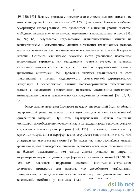 Эпидуральная анестезия, используемая в абдоминальной хирургии, особенно у пожилых пациентов, как правило, предохраняет от интраоперационного отражения боли, чего невозможно добиться увеличением доз внутривенных анестетиков и опиоидных анальгетиков, а также их комбинацией [7; 33; 89; 96; 154]. Боль является серьезной проблемой для многих пациентов, перенесших операцию. Снижение болевого синдрома способствует не только психологическому комфорту пациентов, но и улучшению исхода операций, особенно таких травматичных, как операции на толстом кишечнике. Эффективное послеоперационное обезболивание улучшает течение послеоперационного периода [6-8; 13; 57; 73; 103; 118]. Существующие исследования показывают, что любой вариант многокомпонентной сбалансированной анестезии, даже при сочетании с мощным опиоидным анальгетиком, не создает полноценной защиты организма от операционной травмы и не оптимизирует течение послеоперационного периода [49; 130; 163]. Важным признаком хирургического стресса является выраженное повышение уровней глюкозы в крови [67; 120]. Центральные блокады ослабляют гуморальную стресс-реакцию, что проявляется в снижении уровня глюкозы, свободных жирных кислот, кортизола, адреналина и норадреналина в крови [33; 34; 56; 65]. Результатом недостаточной антиноцицептивной защиты на периферическом и сегментарном уровнях в условиях традиционных методов анестезии является активация симпатического компонента вегетативной нервной системы. Основное клиническое значение имеет увеличение плазменной концентрации кортизола, как стандартного гормона стресса, и глюкозы, абсолютное значение которых определяется тяжестью хирургической травмы и проводимой анестезией [65]. Продукция глюкозы увеличивается за счет гликогенолиза в печени, индуцируемого симпатической адренергической стимуляции. Неблагоприятное влияние послеоперационной гипергликемии связано с нарушением репоративных процессов, увеличением вероятности инфицирования раны и развитием послеоперационных осложнений [32; 33; 83; 120].