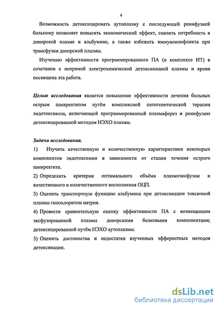 Эндотоксикоз при остром панкреатите развивается вследствие поражения естественных систем детоксикации организма, чему способствует выброс в кровеносное русло липолитических ферментов в высоких концентрациях, кининов, продуктов извращённого обмена и перекисного окисления липидов, иммунных комплексов, продуктов клеточной и белковой деградации, медиаторов системного воспаления, а также продуктов нормального обмена веществ в аномально-высоких концентрациях (Гельфанд Б.Р. и др., 2000). Следовательно, своевременное удаление из циркуляторных систем компонентов эндотоксикоза является одним из обязательных условий эффективной интенсивной терапии. Это подтверждается тем, что в 80-90% случаев причиной летальных исходов является полиорганная и полисистемная недостаточность, обусловленная развитием жесточайшего эндотоксикоза (Федоровский Н.М., 1993, 2002; Кон Е.М., 2001 и др.). Для лечения панкреатогенного эндотоксикоза в настоящее время, в комплексной интенсивной терапии, достаточно широко применяются следующие методы гемокоррекции и экстракорпоральной детоксикации: гемосорбция (ГС), лимфосорбция (ЛС), плазмосорбция (ПС), гемодиализ (ГД), плазмаферез (ПА), ультрафиолетовое облучение крови (УФОК), непрямое электрохимическое окисление крови (НЭХО). Однако все они не лишены отрицательных эффектов и имеют определённые показания и противопоказания к применению у данной категории больных. Согласно мнению подавляющего большинства клиницистов, наиболее эффективным методом борьбы с эндогенной интоксикацией был признан плазмаферез (Федоровский Н.М., 1993, 1995, 2003; Гостищев В.К. и соавт., 1995; Воинов В.А., 2002). Вместе с тем, положительный результат лечения методом программированного плазмафереза (ПА) у больных острым панкреатитом возможен только в случаях адекватного восполнения эксфузированной плазмы донорскими белковыми компонентами (альбумин, свежезамороженная плазма) и плазмозаместителями (ГЭК). В этой связи, полноценная коррекция плазмоэксфузии затруднительна, ввиду дороговизны белковых препаратов, а также риска иммуноконфликта и инфицирования больных. Поэтому клиницистами ведутся поиски экономически доступных и безопасных средств, для адекватного восполнения эксфузированной плазмы (Полиров А.А., 1995 и др.).