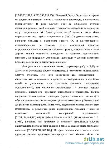 [32,34,114,443,445,465]. В работах Коновалова Б.А. (1983), Рядового Г. А. (1989), показано, что примерно в половине выявленных случаев лактатацидоза причины были связаны с ранее имевшими место эпизодами гипоксии [53,98,99,210,287,372,], На фоне повышенного лактата крови функция системы транспорта кислорода у таких больных была, как