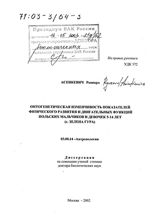 Асенкевич Рышард. Онтогенетическая изменчивость показателей физического развития и двигательных функций польских мальчиков и девочек 5 - 14 лет : г. Зелёна Гура : диссертация ... доктора биологических наук : 03.00.14.- Москва, 2002.- 458 с.: ил. РГБ ОД, 71 03-3/64-3