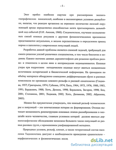 Этот пробел наиболее ощутим при рассмотрении эколого-географических показателей, особенно в высокогорных условиях республики, полагая, что реакция организма на огромное количество явлений окружающей среды определяется способностью мозга прогнозировать дальнейший ход событий (П.И. Анохин, 1968). Следовательно, изучение ассоциативных связей кожных рисунков с другими физиологическими признаками представляется актуальным, и весьма перспективным в определении границ нормы и патологии у современных популяций людей.