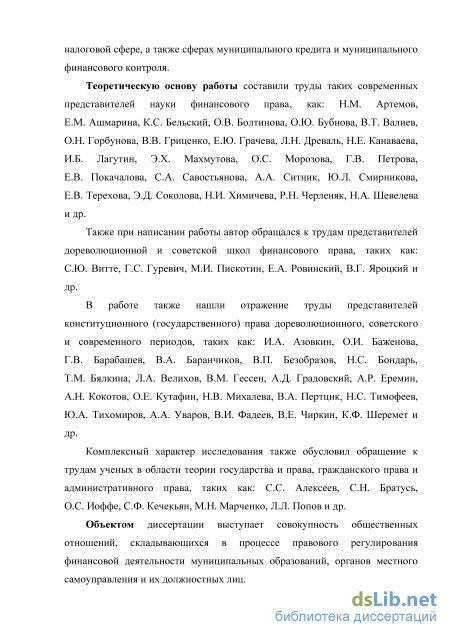 Подчеркнем, что несмотря на наличие работ, в которых изучаются отдельные особенности финансово-правового положения муниципальных образований, в настоящее время отсутствуют исследования, в которых, с учетом современного состояния правового регулирования финансовых отношений в Российской Федерации, была бы проведена комплексная оценка состояния финансово-правового регулирования основных направлений финансовой деятельности муниципальных образований в бюджетной и налоговой сфере, а также сферах муниципального кредита и муниципального финансового контроля.