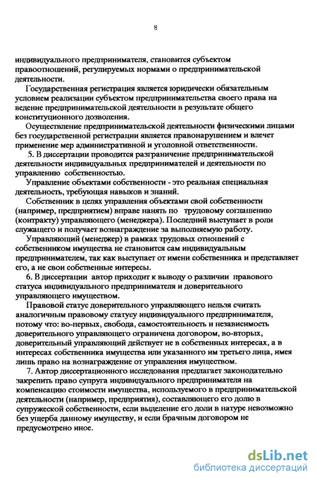 6. В диссертации автор приходит к выводу о различии правового статуса индивидуального предпринимателя и доверительного управляющего имуществом.