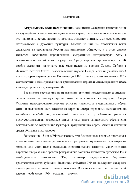 Актуальность темы исследования. Российская Федерация является одной из крупнейших в мире многонациональных стран, где проживают представители 193 национальностей, каждая из которых обладает уникальными особенностями материальной и духовной культуры. Многие из них на протяжении веков сложились на территории России как этнические общности, и в этом смысле являются коренными народностями, сыгравшими историческую роль в формировании российского государства. Среди народов, проживающих в РФ, особое место занимают коренные малочисленные народы Севера, Сибири и Дальнего Востока (далее -малочисленные народы Севера, если не указано иное), права которых гарантируются Конституцией РФ, а также законодательством РФ в соответствии с общепризнанными принципами и нормами международного права и международными договорами РФ.