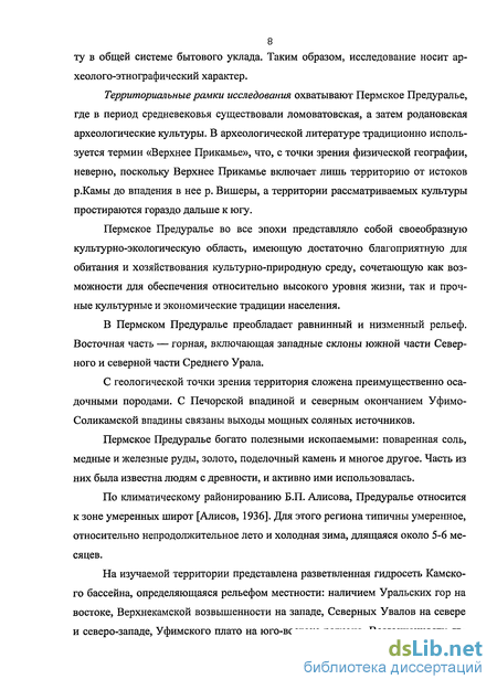 Территориальные рамки исследования охватывают Пермское Предуралье, где в период средневековья существовали ломоватовская, а затем родановская археологические культуры. В археологической литературе традиционно используется термин «Верхнее Прикамье», что, с точки зрения физической географии, неверно, поскольку Верхнее Прикамье включает лишь территорию от истоков р.Камы до впадения в нее р. Вишеры, а территории рассматриваемых культуры простираются гораздо дальше к югу.