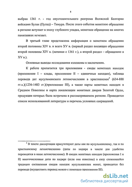Хронологические рамки работы охватывают период с середины XIII и до второй половины XV в. - от возникновения Золотой Орды и возобновления монетного обращения (монеты с именем багдадского халифа ан-Насир лид-Дина 1240-х гг.) до полного прекращения чеканки и массового обращения золотоордынских монет (вторая половина XV в.). Время конца XV - начала XVI в. связано с распространением русских монет и определяет новые тенденции в монетном обращении.