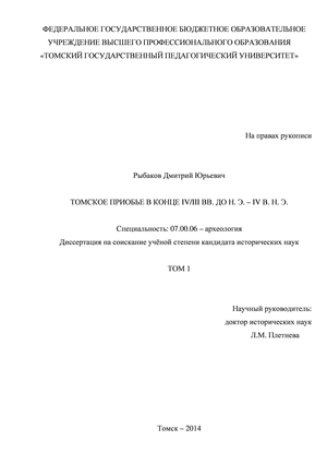 Источники. Источниковую базу исследования составляют материалы 25 поселенческих комплексов и 8 отдельных находок Томского Приобья конца IWIII вв. до н. э. - IV в. н. э. Данные материалы получены в результате работ Л.М. Плетневой, Л.А. Чиндиной, В.И. Матющенко, А.Д. Гамана, Р.А. Ураева, Н.В. Березовской, Н.В. Торощиной, Л.В. Панкратовой, С.А. Терехина, З.М. Габдрахмановой, А.Е. Логиновой, А.В. Логинова, А.Ю. Цуриковой, В.А. Ивлева, М.А. Рудковской, И.В. Ушаковой. Коллекции трех памятников получены в результате полевых работ под руководством автора: городище Рюзаково (Духовое) (2003, 2004, 2005, 2007, 2010 гг.), поселение Рюзаково (Духовое) (2009 г.), городище Тимирязеве III (2009, 2013 гг.). В исследованиях еще 9 памятников автор принимал участие как участник полевых работ: Киреевское III городище (руководитель Л.А. Чиндина, 1996 г.), поселение Половинка I (руководитель В.А. Ивлев, 1999, 2001, 2002 гг.), городища Чернилыциково II, III (Курлак I), поселение Чернилыциково II (Курлак I) (руководитель А..Е. Соколова, 2008 г.; руководитель А.Ю. Цурикова 2011 г.), городище Рюзаково II, поселения Рюзаково II, III (руководитель Е.В. Рыльцева, 2004 г.; руководитель А.Е. Логинова, 2009, 2010 гг.), городище Мурашка, поселение Мурашка V (руководитель А.Е. Логинова, 2010, 2011 гг.), городища Нагорный Иштан II (руководитель А.Е. Логинова, 2010; руководитель А.Ю. Цурикова 2012 г.). Также при написании диссертации использованы материалы других археологических коллекций, полученные в результате раскопок памятников Томского Приобья. Особо следует отметить остеологические материалы, полученные при раскопках городища Мурашка, что дало возможность, определит их видовой состав без учета количества особей.
