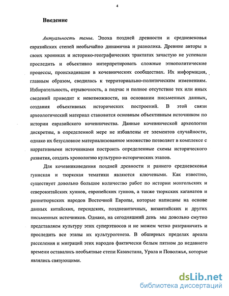 Для кочевниковедения поздней древности и раннего средневековья гуннская и тюркская тематики являются ключевыми. Как известно, существует довольно большое количество работ по истории монгольских и северокитайских хуннов, европейских гуннов, а также тюркских каганатов и раннетюркских народов Восточной Европы, которые написаны на основе данных китайских, персидских, позднеантичных, византийских и других письменных источников. Однако, на сегодняшний день мы довольно смутно представляем культуру этих суперэтносов и не можем четко разграничить и проследить все этапы их культурогенеза. В обширных пределах ареала расселения и миграций этих народов фактически белым пятном до недавнего времени оставались необъятные степи Казахстана, Урала и Поволжья, которые являлись связующими.
