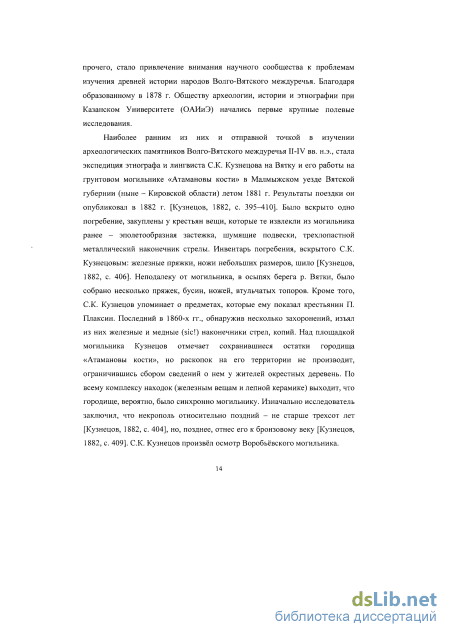 Этапным в изучении древностей первой половины I тыс. н.э. на раннем этапе стали работы А.А. Спицына. Ему принадлежит заслуга первой систематизации коллекций с памятников в басе. р. Вятки и оригинальных разработок в области хронологии. В связи с этим необходимо упомянуть и его «Каталог древностей Вятского края» [Спицын, 1881, с. 25-91] с дополнениями [Спицын, 1884, с. 180-191], который включал информацию по более чем 130 памятникам. Большим достижением для археологии того времени была фундаментальная работа А.А. Спицына «Археологические розыскания о древнейших обитателях Вятской губернии» [Спицын, 1893], содержавшая немалое количество материалов и исторических выводов.