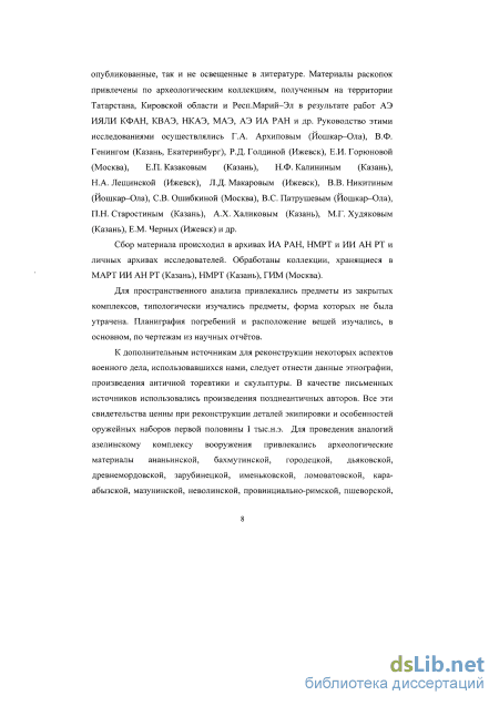 К дополнительным источникам для реконструкции некоторых аспектов военного дела, использовавшихся нами, следует отнести данные этнографии, произведения античной торевтики и скульптуры. В качестве письменных источников использовались произведения позднеантичных авторов. Все эти свидетельства ценны при реконструкции деталей экипировки и особенностей оружейных наборов первой половины I тыс. н.э. Для проведения аналогий азелинскому комплексу вооружения привлекались археологические материалы ананьинской, бахму-тинской, городецкой, дьяковской, древнемордовской, зарубинецкой, именьков-ской, ломоватовской, кара-абызской, мазунинской, неволинской, провинциально-римской, пшеворской, пьяноборской, средне- и позднесарматской, Черняховской культур, а так же памятников андреевско-писеральского типа и рязано-окских могильников.