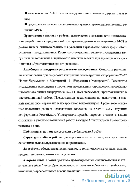 Апробация и внедрение результатов исследования. Основные результаты использованы при разработке концепции реконструкции микрорайона 26-27 Новых Черемушек, в Мастерской 11, (Управления Моспроекті). Результаты исследования воплощены в проектном предложении строящегося многофункционального здания микрорайона 26-27 Новых Черемушек, представленного в диссертационной работе. Предложенные рекомендации по эксплуатации зданий нашли свое отражение в построенном кондоминиуме. Кроме того основные положения данного исследования доложены на XXIV и XXVI научных конференциях Российского Университета дружбы народов, а также и нашли отражение в учебно-методической работе кафедры Архитектуры и Градостроительства РУДН.