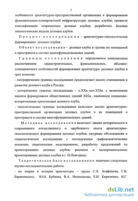 Учитывая специфику архитектурного объекта делового клуба, который представляет архитектурно-пространственную форму организации в виде приспособления существующей застройки и использование инфраструктуры разнородных учреждений, данное исследование строится на выявлении общих тенденций форм функционально-пространственной организации, анализа функциональной деятельности и разных сторон происходящих процессов.