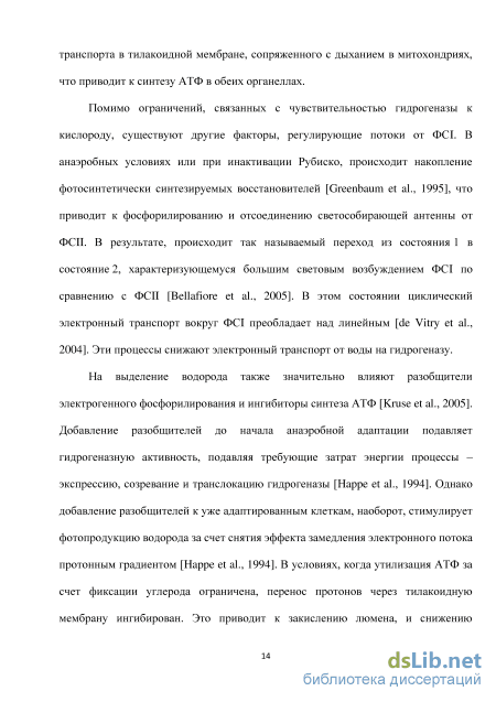На выделение водорода также значительно влияют разобщители электрогенного фосфорилирования и ингибиторы синтеза АТФ [Kruse et al., 2005]. Добавление разобщителей до начала анаэробной адаптации подавляет гидрогеназную активность, подавляя требующие затрат энергии процессы – экспрессию, созревание и транслокацию гидрогеназы [Happe et al., 1994]. Однако добавление разобщителей к уже адаптированным клеткам, наоборот, стимулирует фотопродукцию водорода за счет снятия эффекта замедления электронного потока протонным градиентом [Happe et al., 1994]. В условиях, когда утилизация АТФ за счет фиксации углерода ограничена, перенос протонов через тилакоидную мембрану ингибирован. Это приводит к закислению люмена, и снижению фотосинтетической активности [Lee and Greenbaum, 2003]. Добавление ионофоров приводит к увеличению электронного транспорта на гидрогеназу и, следовательно, выделения H2.